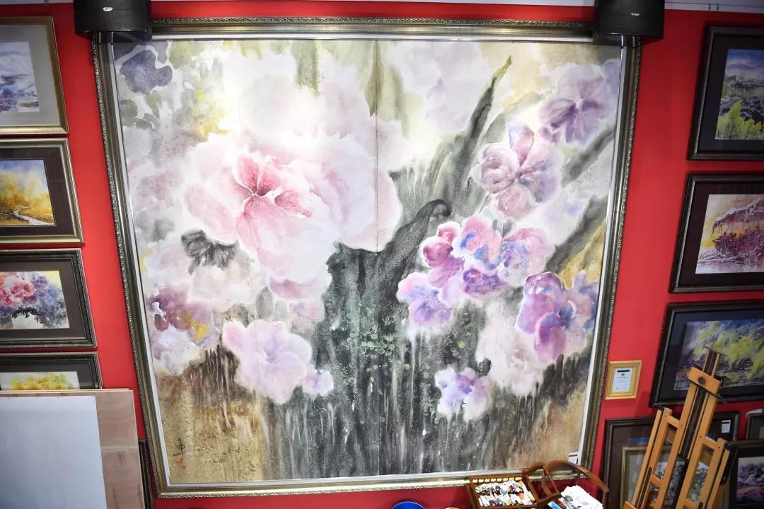 這副水彩畫的創(chuàng)作過程實(shí)際上也是非常艱辛的,由于巨大的尺寸普通的水彩繪畫筆以及繪畫方法根本不能一筆畫完。于是許世虎老師便采用了局部表現(xiàn)法的方式,從一個角到另一個角,從一個方向到另一個方向,由一片葉子、一片花瓣、再到一朵花,耗盡心力才最終得以完成。