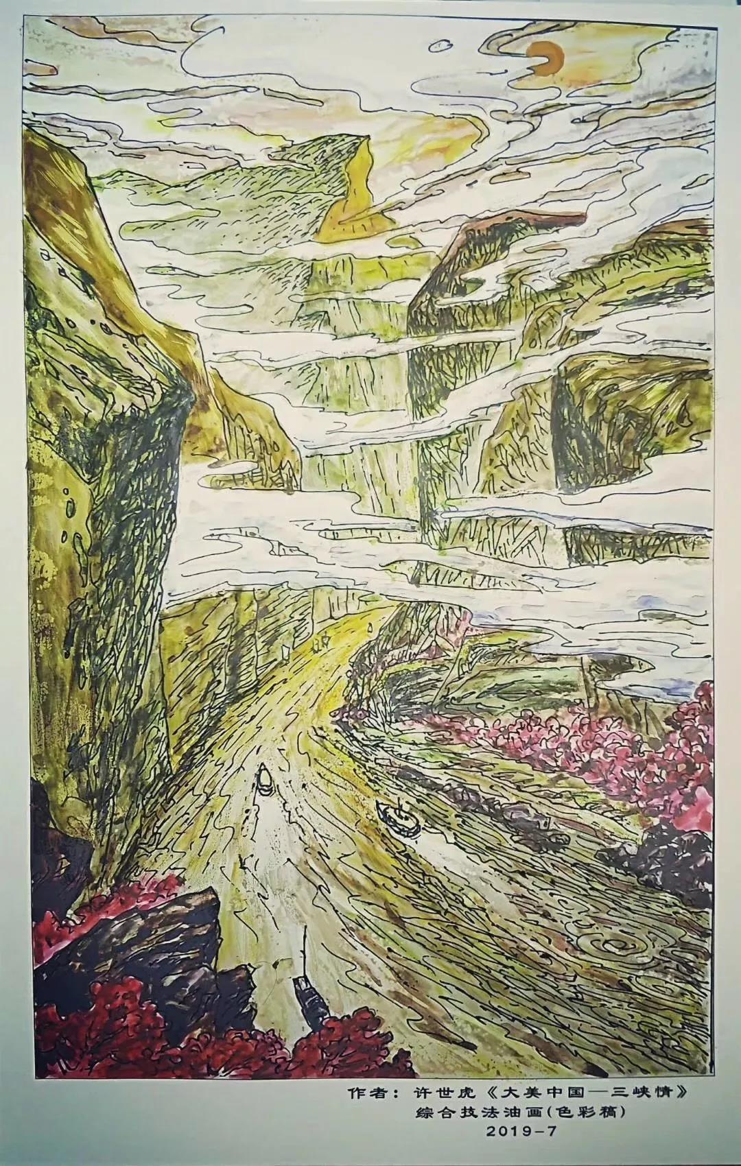 最近,許世虎老師也正在創(chuàng)作一套名為《大美中國--三峽情》的系列壁畫,畫面主題以長江、黃河、布達(dá)拉宮等中國典型的景觀為主?!坝梦业囊环N創(chuàng)作來比較系統(tǒng)地介紹我國的美麗山川,用藝術(shù)來表現(xiàn)我們的大好河山,以此來承擔(dān)一種社會的責(zé)任感與擔(dān)當(dāng)?!?/span>許世虎老師希望通過自己的努力來創(chuàng)作一些對于國家對于人民真正有用的作品,以此傳遞正能量。