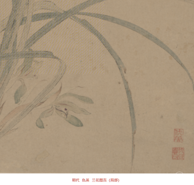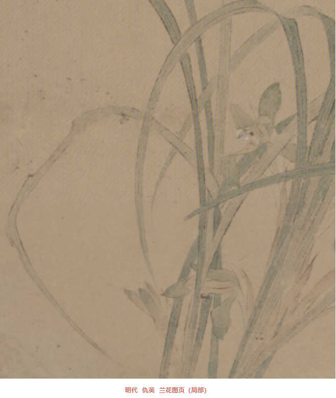 這是一幅散頁的,用“圖頁裝裱”,被專家稱為“孤本”的蘭花圖。畫家用“寫生”的方式描繪這株春蘭。他用纖細又有韌性的線條勾勒春蘭的“疏花與細葉”,用濃淡深淺的變化描繪葉子的向背,用淡雅的綠色暈染蘭葉,設色并不濃艷,屬于淡設色。他巧妙地對“蟲蛀斑點”進行描繪,讓這株春蘭更顯得栩栩如生。