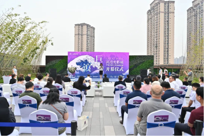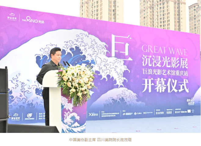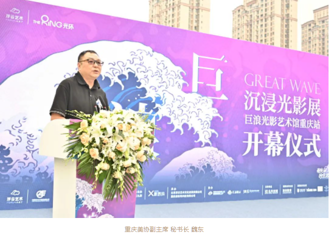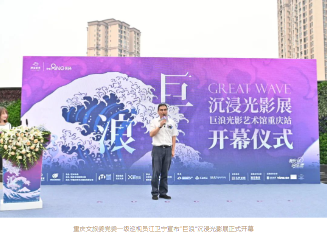 開幕儀式上,總策展人中央美院設(shè)計(jì)學(xué)院副院長靳軍、香港置地重慶總經(jīng)理?xiàng)顦?、中國美協(xié)副主席,四川美院院長龐茂琨、重慶美協(xié)副主席兼秘書長魏東、總制作人浮云藝術(shù)CEO方明分別致辭,隨著重慶文旅委黨委一級(jí)巡視員江衛(wèi)寧宣布“巨浪”沉浸光影展正式開幕,標(biāo)志著經(jīng)過近半年籌備、策展搭建、設(shè)備調(diào)優(yōu)、測(cè)試運(yùn)營之后,正式宣布“巨浪”沉浸光影展在光環(huán)購物公園順利開展。