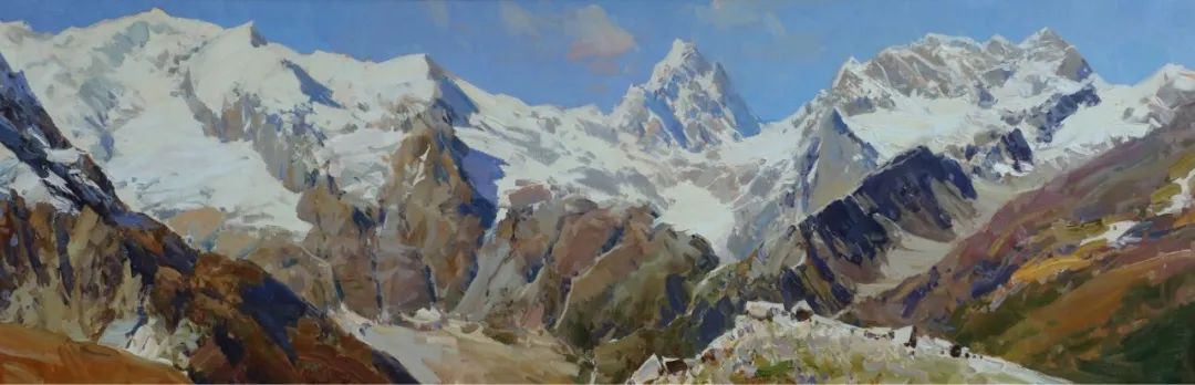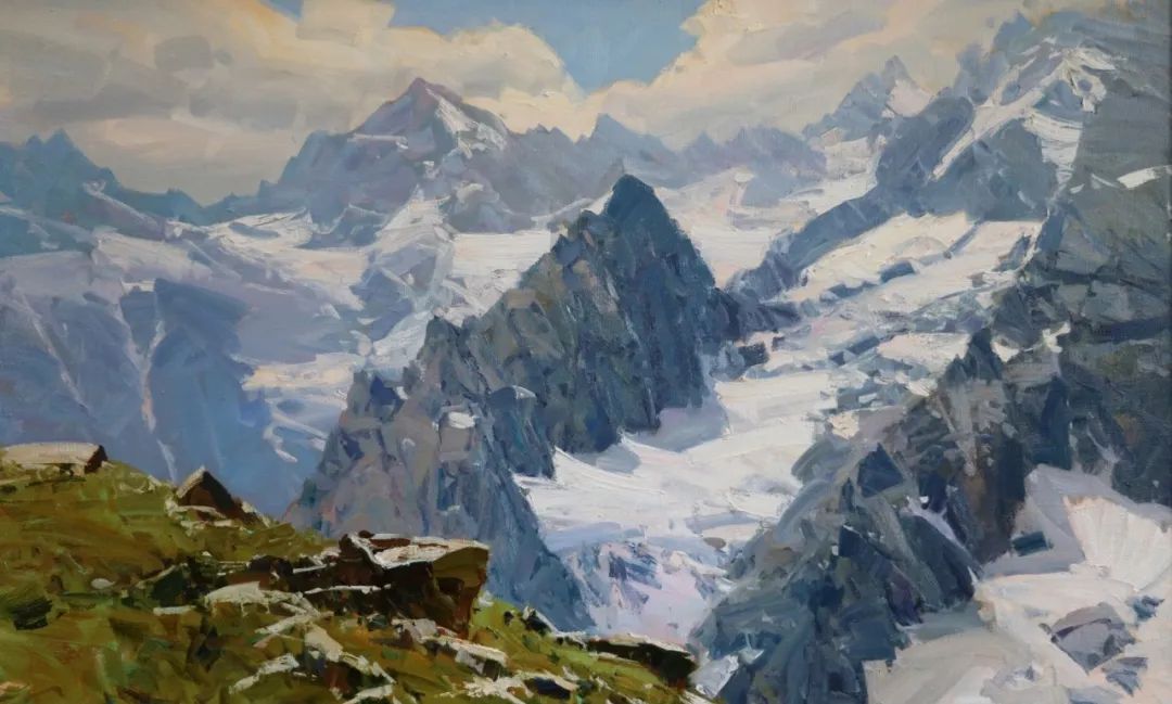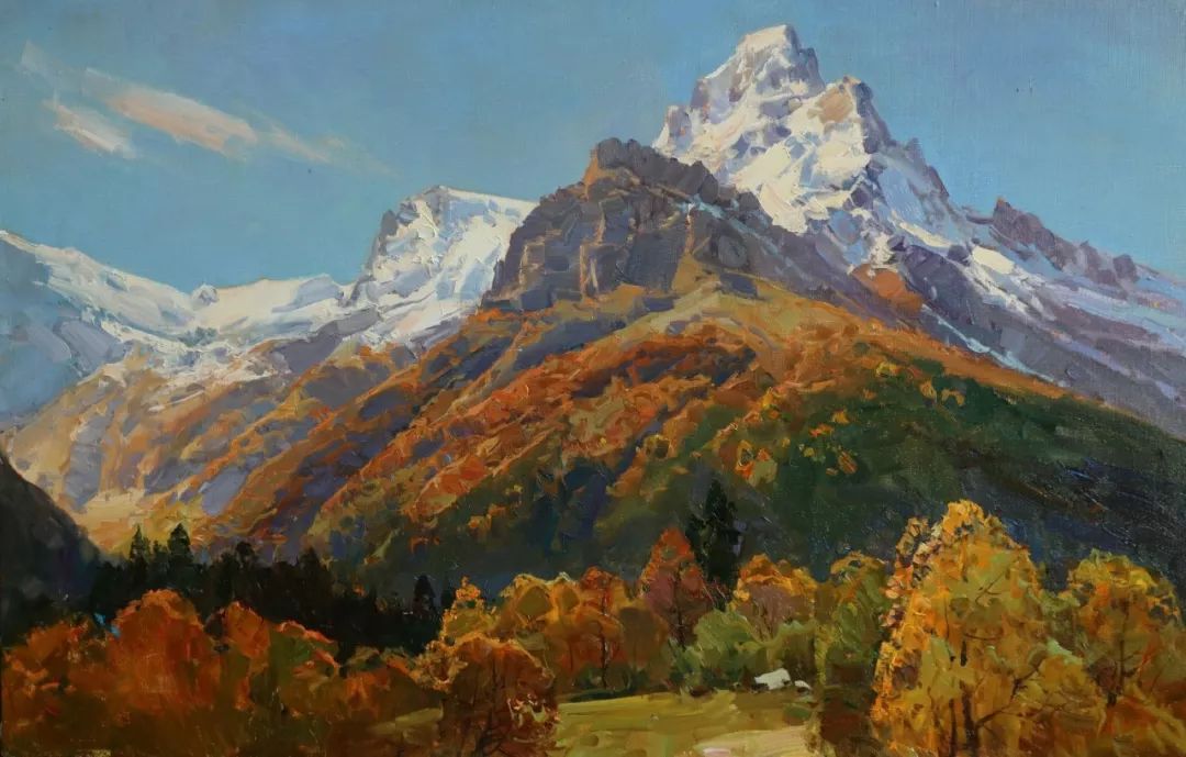 他的雪山峽谷山水畫很有觀賞性。繪畫方法通常包括暖色調(diào)和柔和色調(diào)。他喜歡在他的作品中描繪俄羅斯風(fēng)景之美。