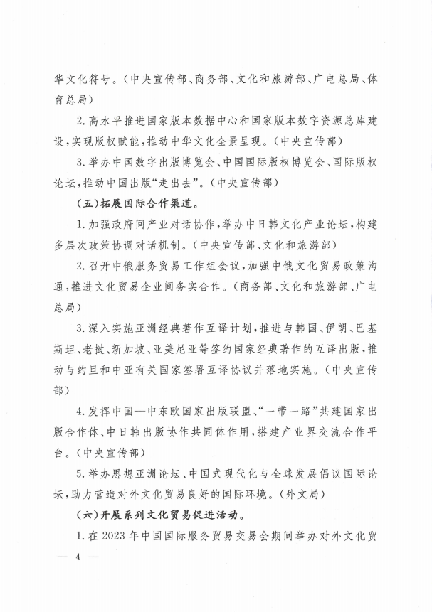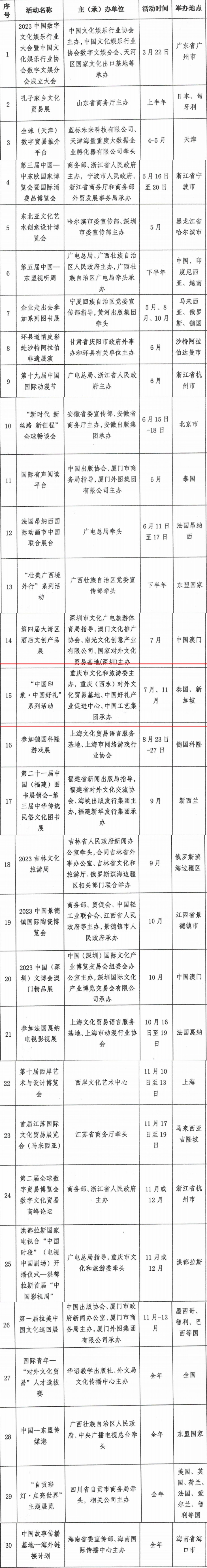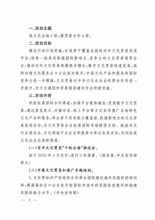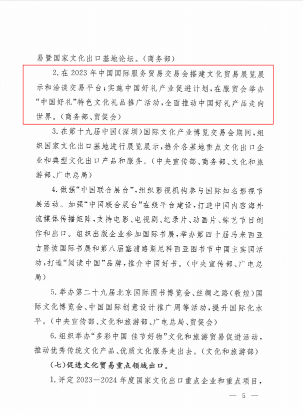 5月23日,由中宣部、商務(wù)部、文旅部等六部門(mén)共同發(fā)起的對(duì)外文化貿(mào)易“千帆出海”行動(dòng)計(jì)劃在福建廈門(mén)啟動(dòng),活動(dòng)主題為“揚(yáng)文化出海之帆,搭貿(mào)易合作之橋”。2023年行動(dòng)計(jì)劃推出30項(xiàng)重點(diǎn)活動(dòng),進(jìn)一步增強(qiáng)中國(guó)文化產(chǎn)品和服務(wù)的國(guó)際競(jìng)爭(zhēng)力,提升文化貿(mào)易對(duì)中華文化“走出去”的帶動(dòng)作用,為文化強(qiáng)國(guó)和貿(mào)易強(qiáng)國(guó)建設(shè)作出積極貢獻(xiàn)。