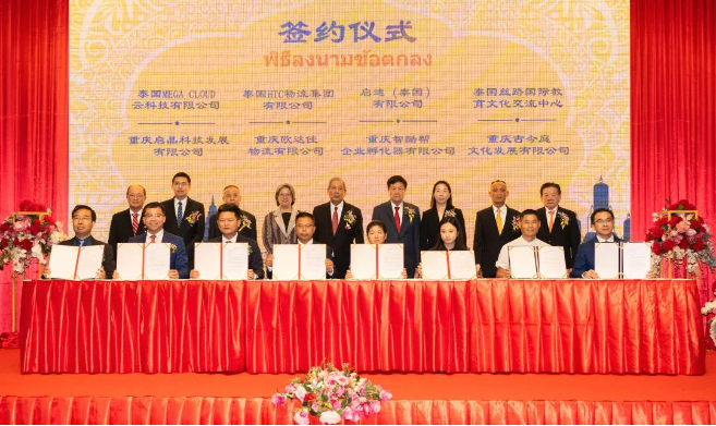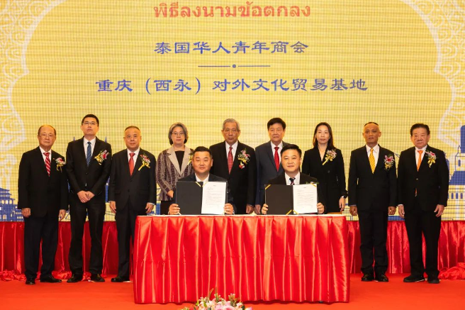 隨后,活動現(xiàn)場進行了簽約儀式。重慶(西永)對外文化貿(mào)易基地與泰國華人青年商會簽訂了平臺戰(zhàn)略合作協(xié)議,重慶啟晶科技發(fā)展有限公司、重慶渝薇坊文化創(chuàng)意有限公司等9家企業(yè)分別就科技發(fā)展、文創(chuàng)產(chǎn)品、物流運輸、基地合作、教育文化、綜合貿(mào)易等板塊與泰國MEGA CLOUD 鴻云科技有限公司、正和文化旅貿(mào)(泰國)有限公司等多家公司簽訂了戰(zhàn)略合作發(fā)展協(xié)議。
