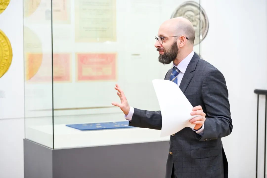 開幕式后,匈牙利中央銀行藝術(shù)與文化部中國市場拓展部負(fù)責(zé)人艾登(Adam Daniel)為大家?guī)砹司实膶?dǎo)覽。